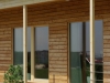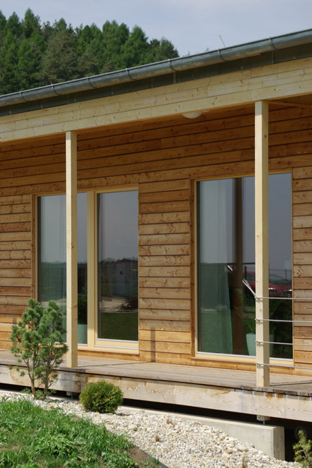 Die einfache rechteckige Gestalt des Bungalows ist von Westen nach Osten ausgerichtet. Exakt nach den Grundsätzen für Passivhäuser zeigen lediglich die kleinen Fenster des Nebengelasses nach Norden, während sich nach Süden große französische Fenster mit dreifacher Verglasung und direktem Zutritt zur Terrasse öffnen. Verwendet wurden die Holzfenster und Außentüren SOLID COMFORT SC92.