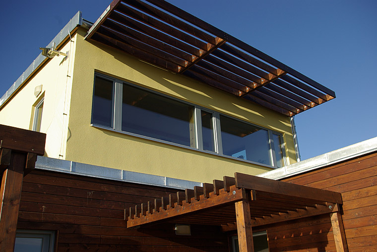 Das Traumhaus wurde als Niedrigenergiehaus unter Verwendung von Elementen des Passivhauses bei größtmöglichem Einsatz natürlicher Baustoffe errichtet, damit dieser Holzbau wirklich umweltfreundlich ist. Im Hinblick auf die ausgezeichneten Werte wurden hier Fenster, Schiebe- und Eingangstüren SOLID COMFORT SC92 verwendet. Der Architekt Josef Smola fand für das Traumhaus eine interessante Lösung von Eckfenstern in Verbindung von Glas ohne Eckpfeiler, indem diese Lösung einen freien, durch nichts beeinträchtigten Blick in die Umgebung des Hauses ermöglicht. Äußerst interessant ist ferner die große verglaste Wand zur Terrasse und zum Schwimmbecken, bestehend aus der Hebeschiebetüre HS Portal mit behindertenfreundlicher Schwelle.